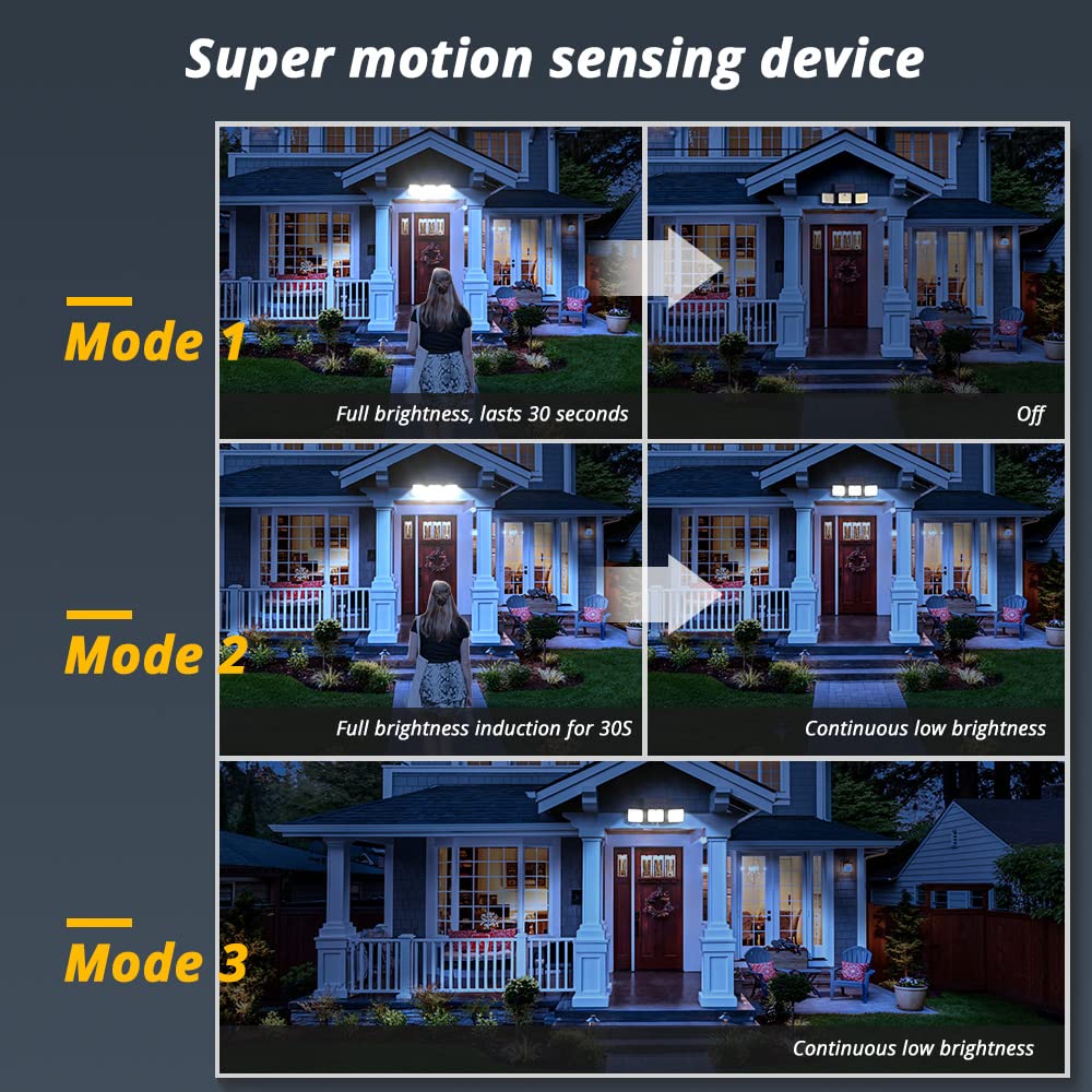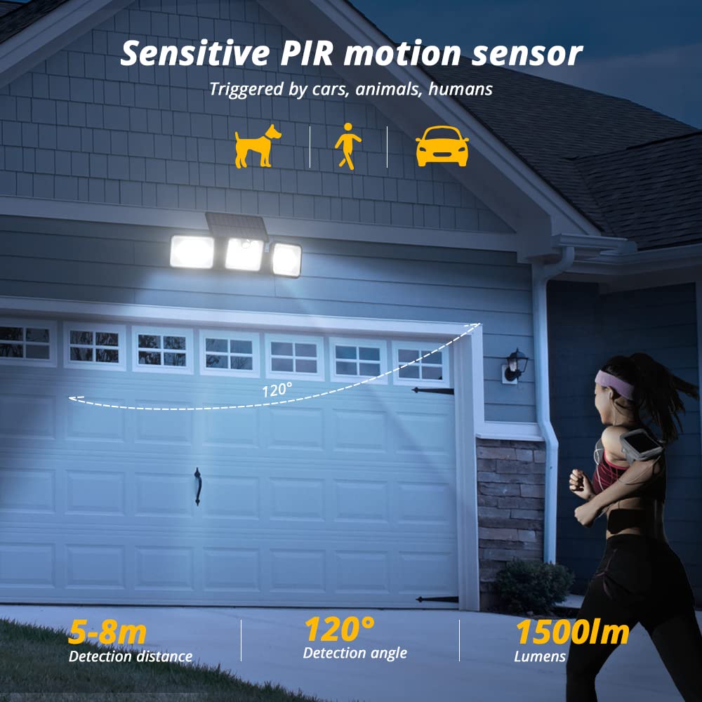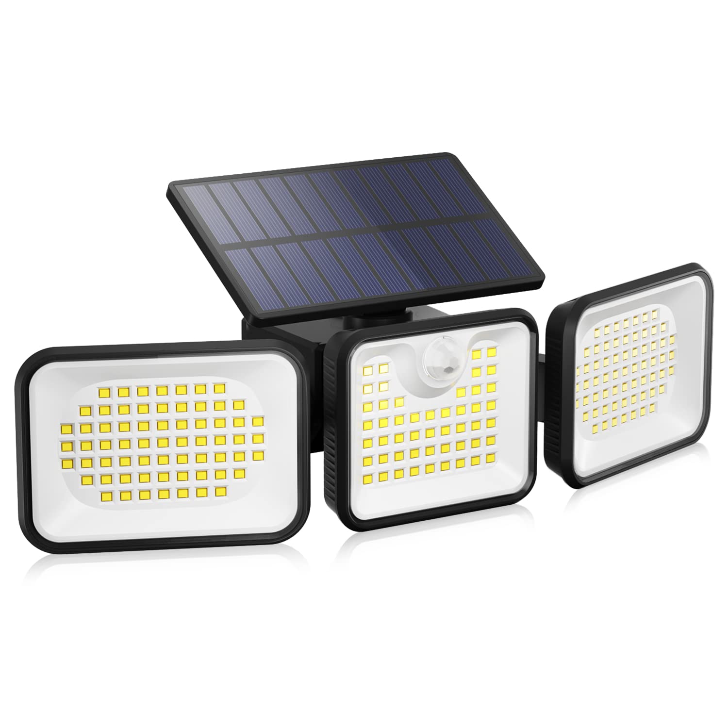 - La Luce Solare con sensore di movimento ultra luminose- Lampade Solari da Esterni di sicurezza solare a tre teste, dotata di 180 erline LED super luminose, produce un’elevata luminosità fino a 500 lm 7500 K e una buona dissipazione del calore, molto più luminosa rispetto ad altre lampade solari a LED simili. Il tasso di conversione dei nostri moduli solari policristallini migliorati è fino al 20%